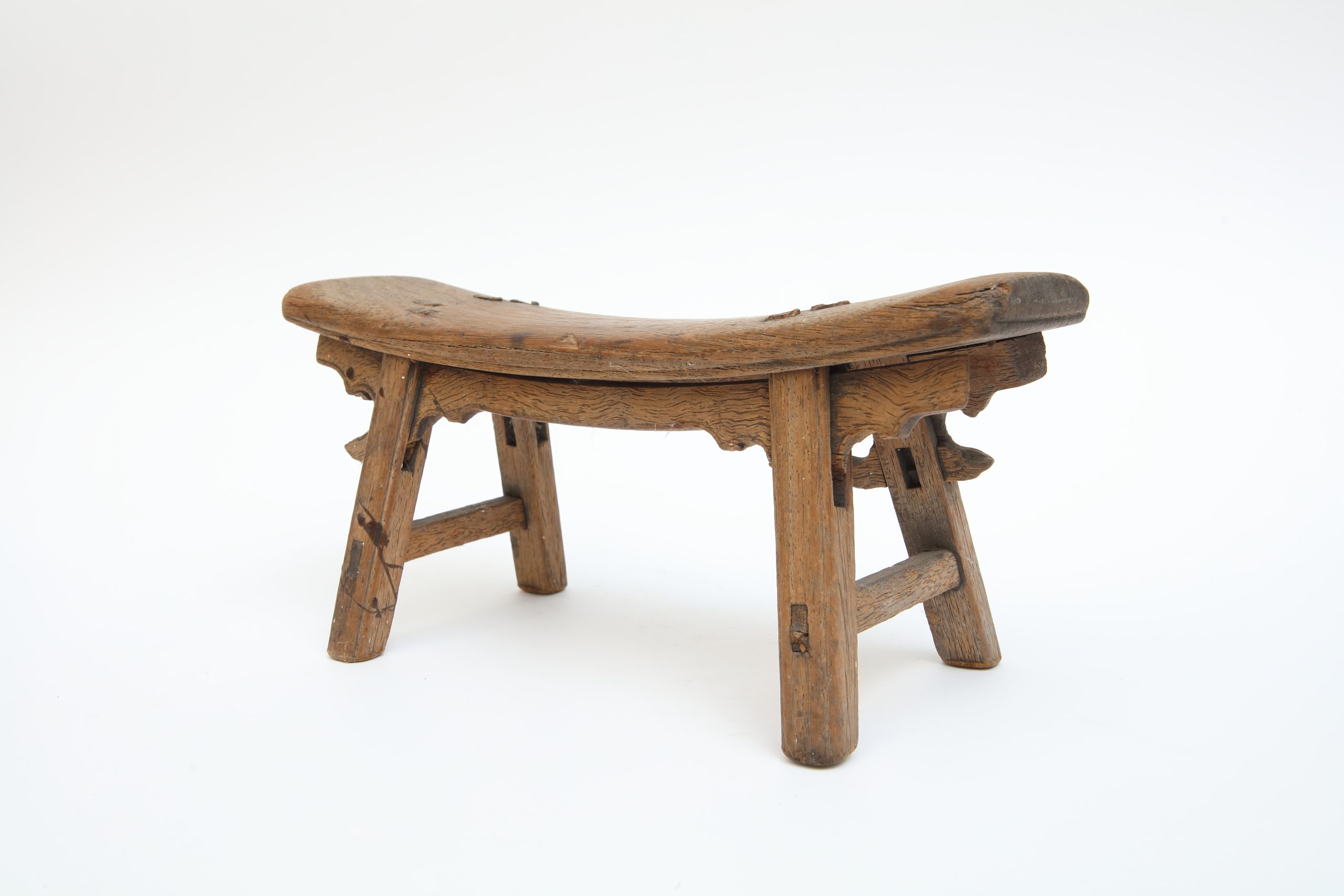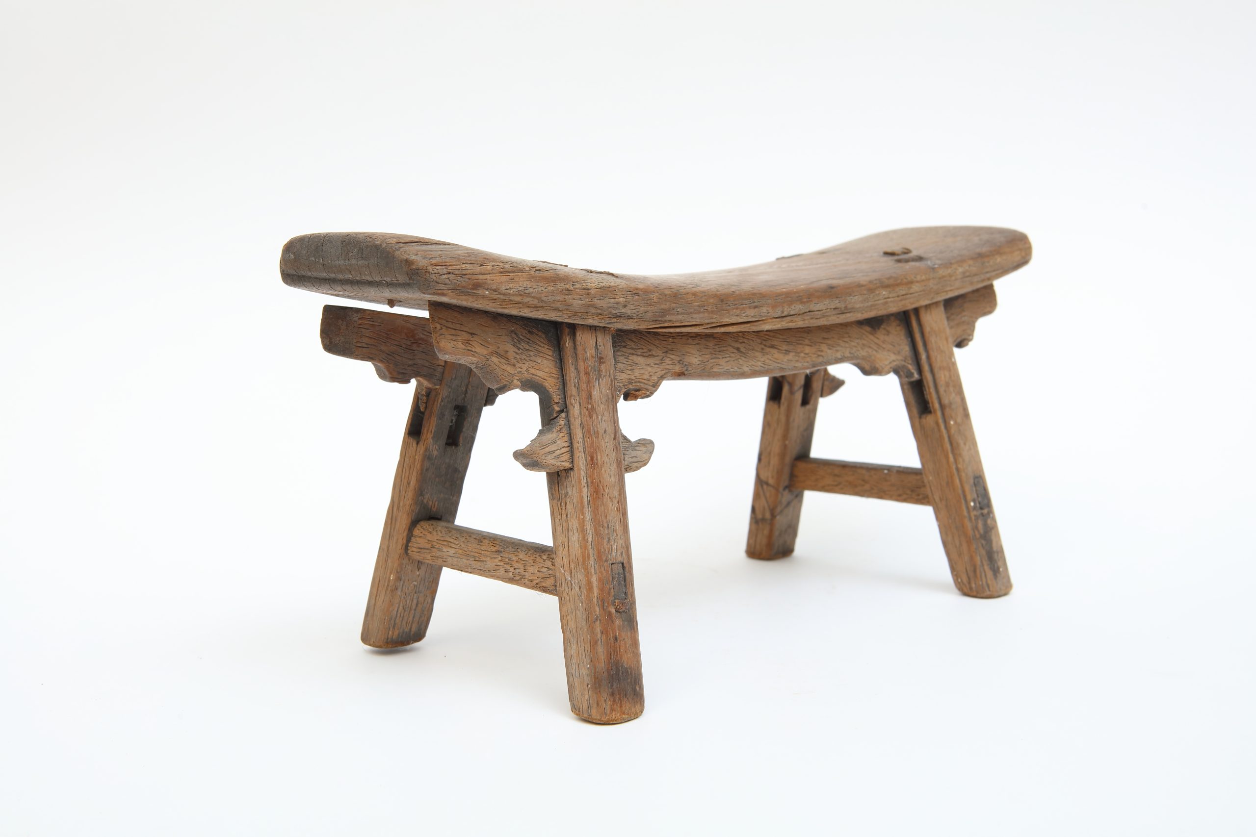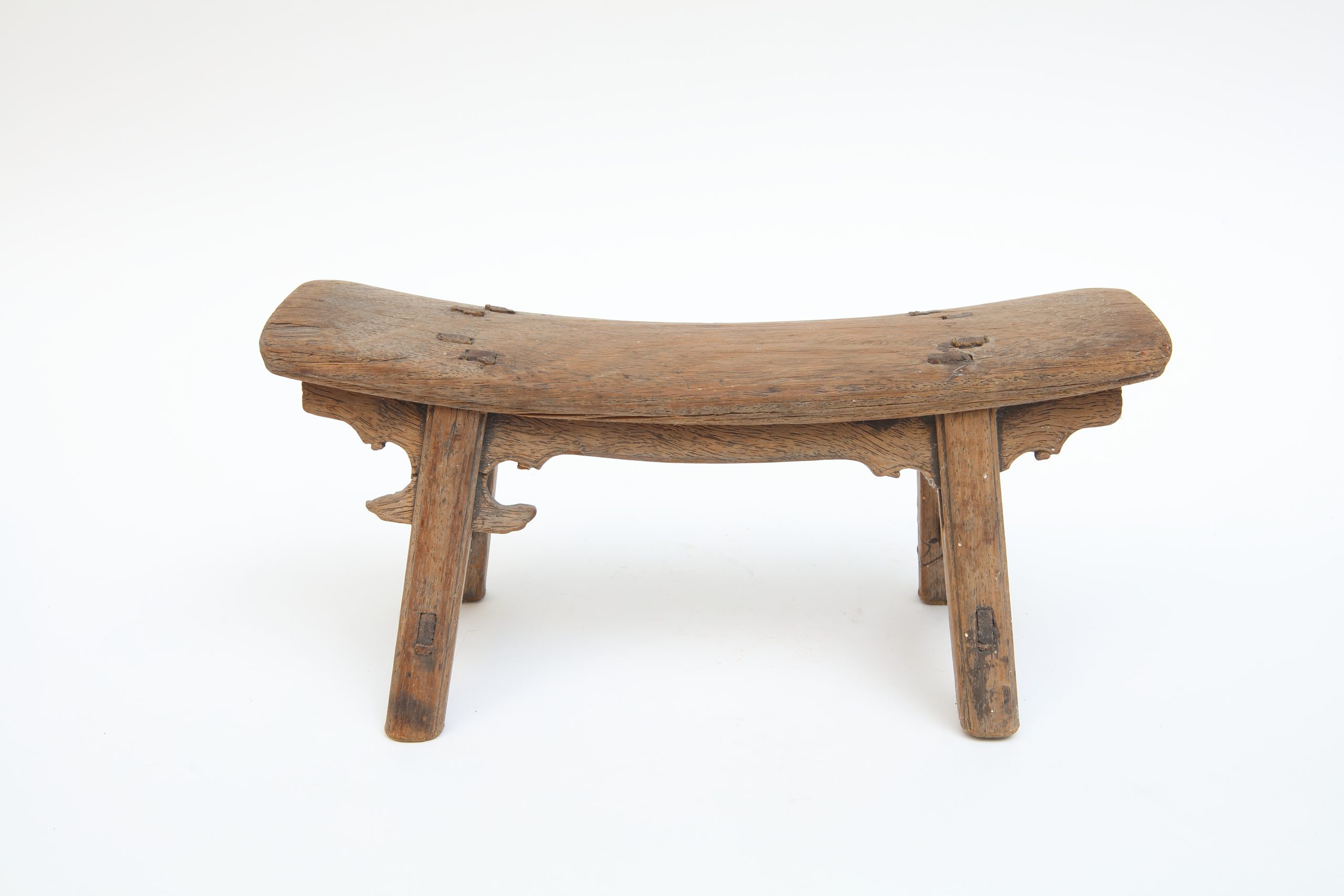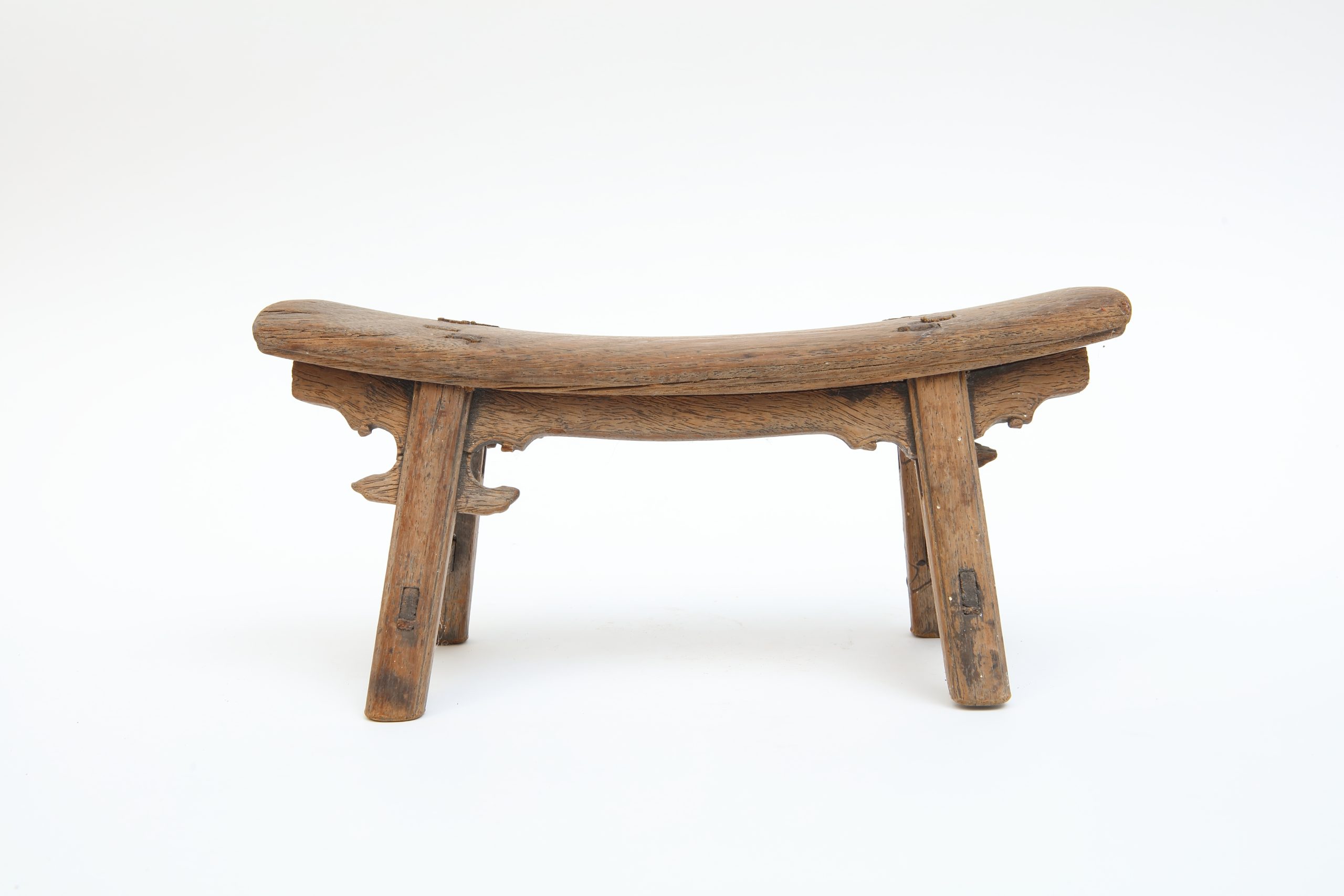 此件木作低伏於地,形制狹長,座面微弓,如一段被時間緩緩按壓出的弧線。兩端輕翹,似順應身體曲度而生;四足外展,結構安定中帶著微妙張力。榫接痕跡不加掩飾,節點清晰可見,使工藝成為可閱讀的語言。木質肌理因歲月磨耗而顯得溫潤斑駁,色澤深淺交錯,如時間在其表面低聲流動。