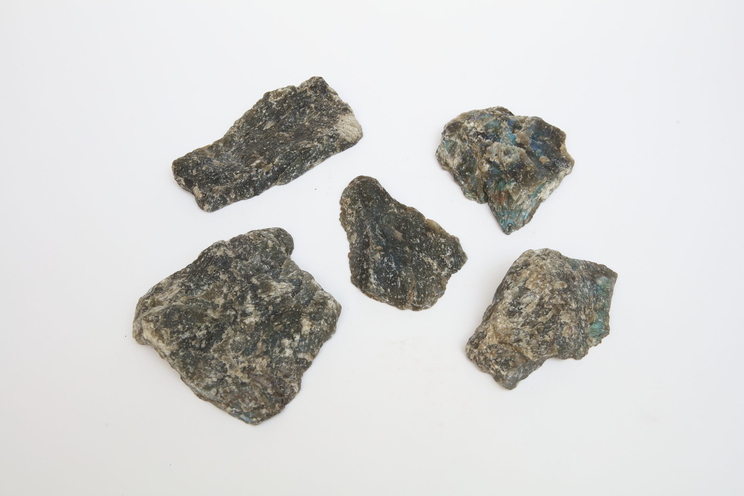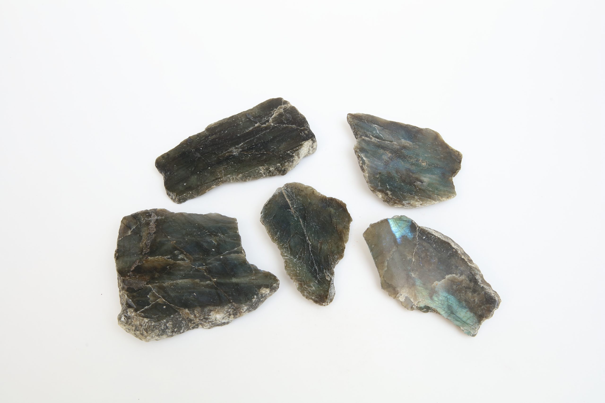 灰綠與藍調交織的薄片礦石,靜置如時間的片刻。光線掠過,其表面忽現幽藍虹彩,彷彿內部潛藏流動的微光。此為拉長石(Labradorite),一種長石礦物,亦稱灰月亮石或閃光石,其層狀結構使光產生反射,形成變幻的金屬光澤。