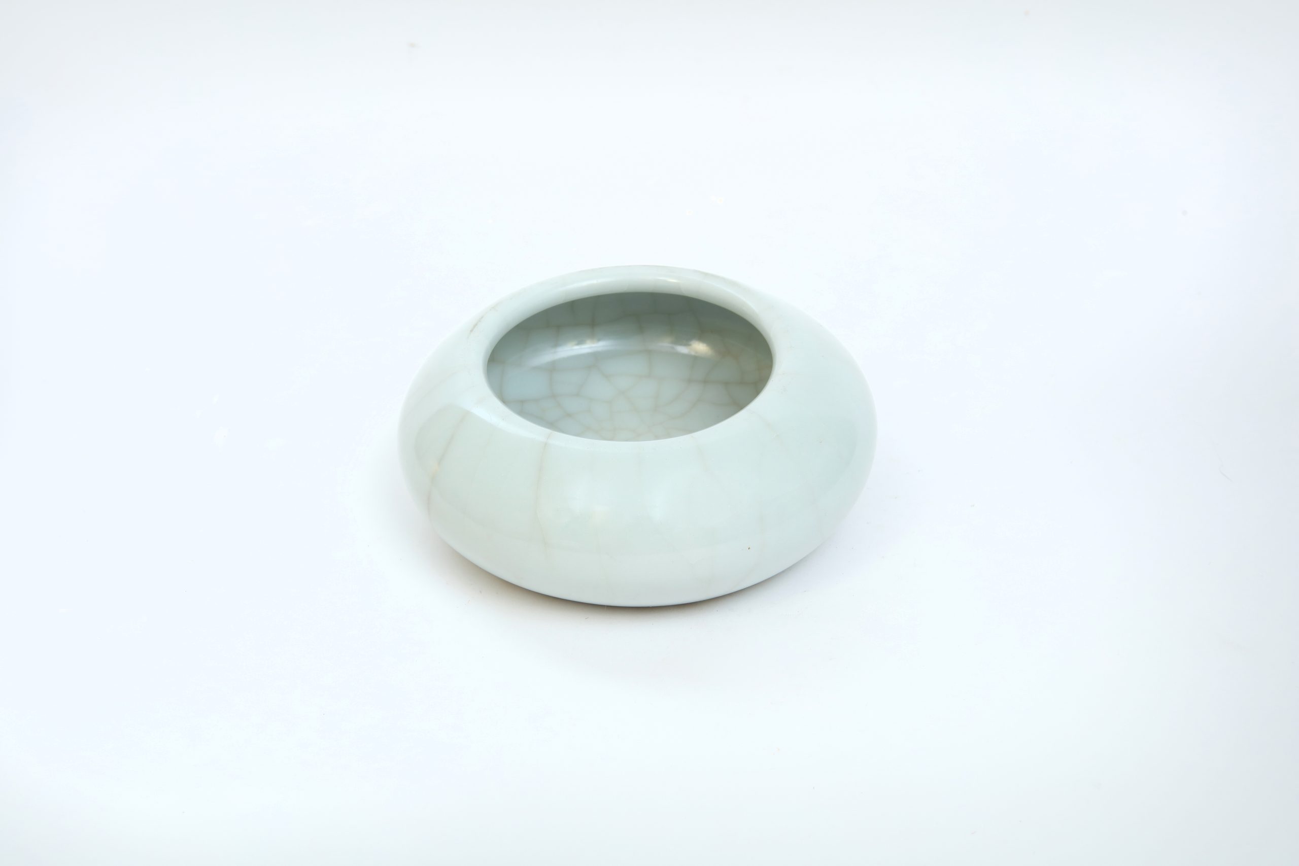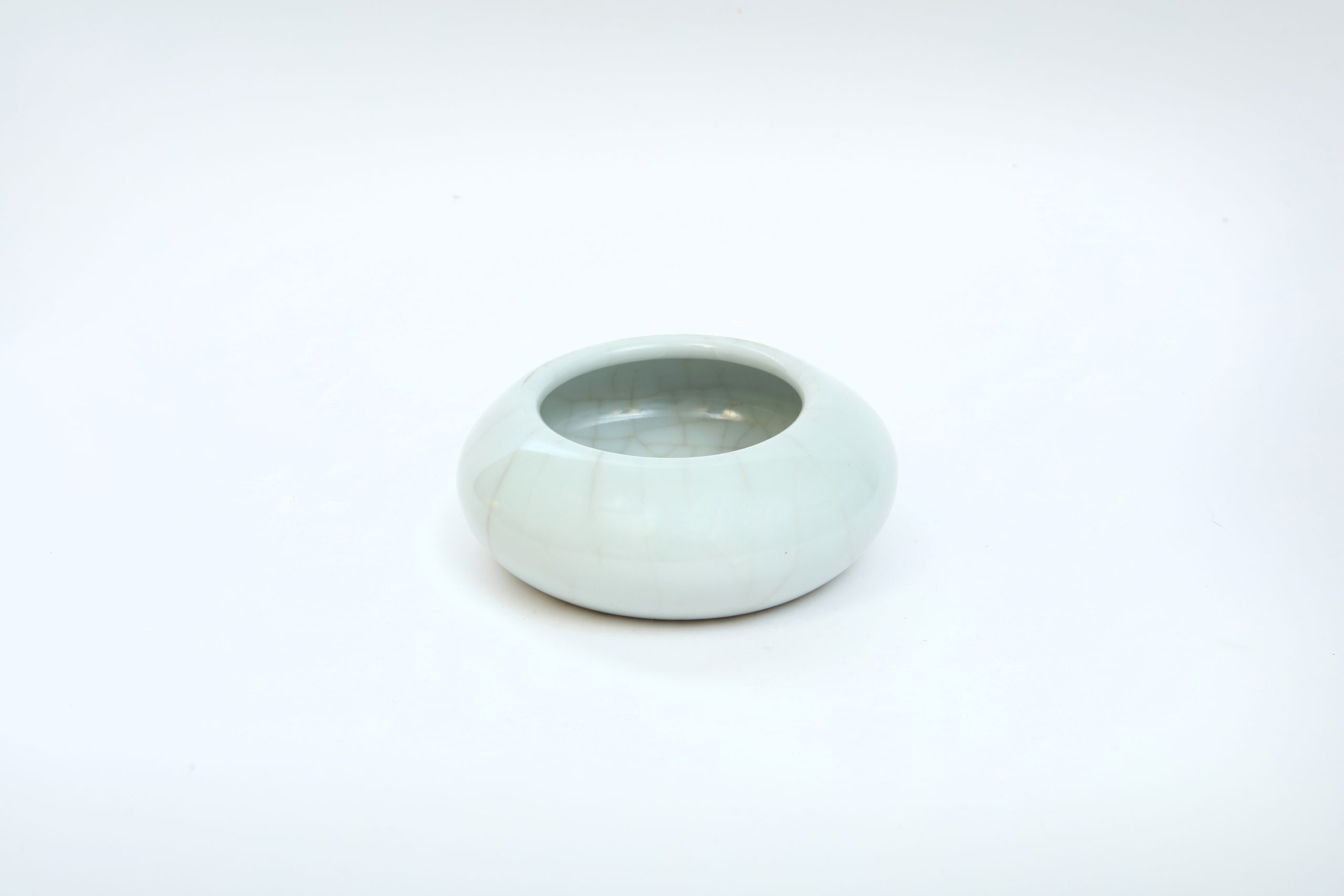 它低伏如一滴未落之水,圓潤而內斂。乳白微青的釉色將光輕輕收納,細碎開片隱現其間,如時間在表層留下的低語。這種溫潤與克制,使器物不顯聲色,卻自有一種靜定的張力。