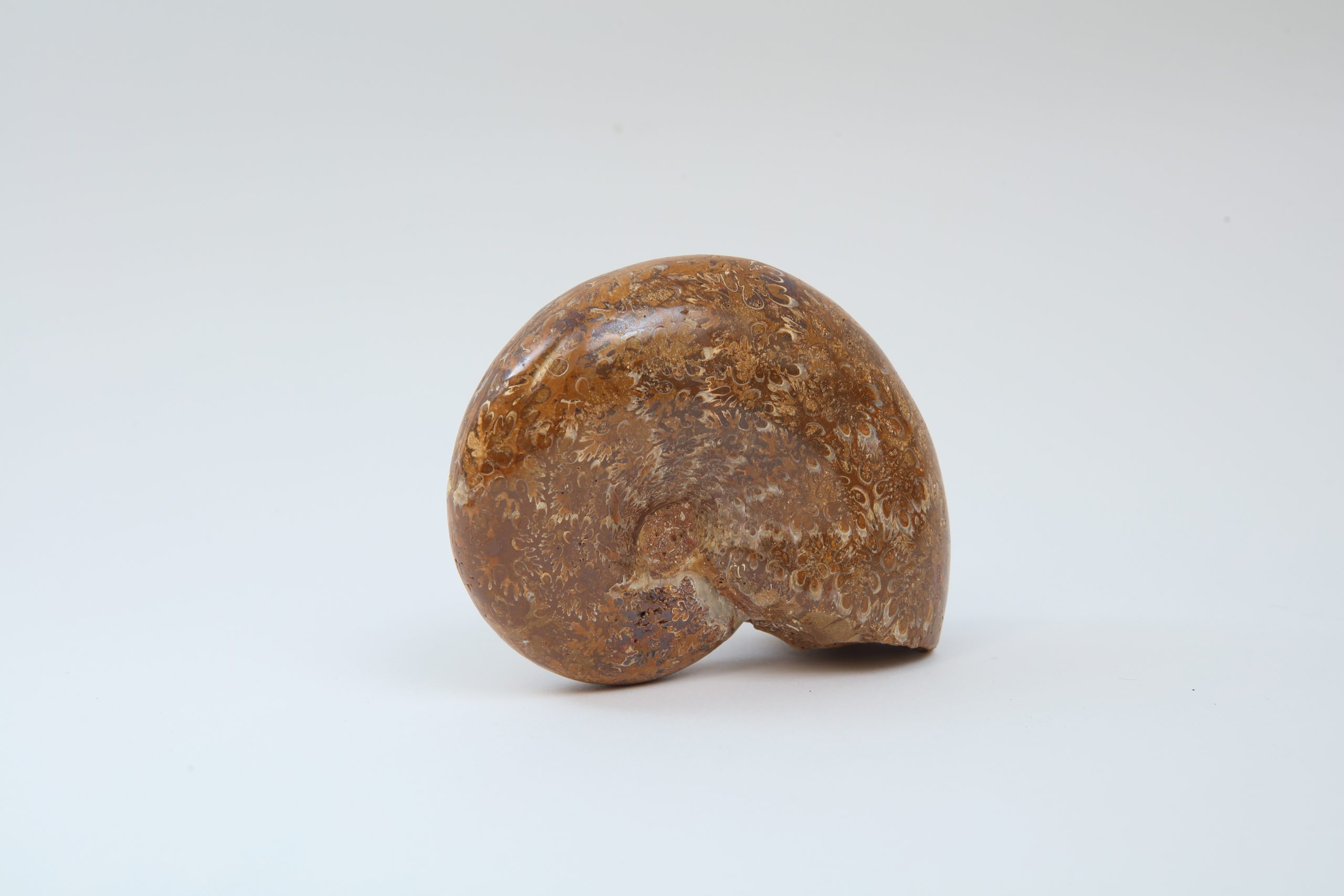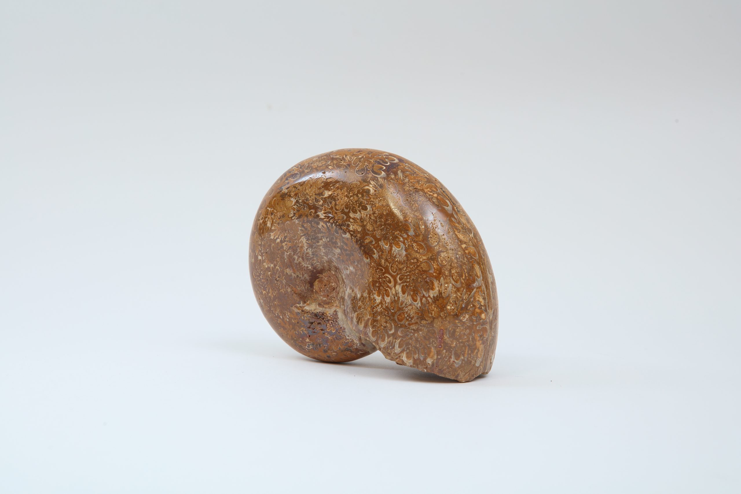 其色澤以暖褐為底,滲入赭紅與乳白紋理,此類菊石多出自馬達加斯加,地質年代橫跨侏羅紀晚期至白堊紀,表面紋飾呈現重複的褶葉圖紋,帶有近似有機體組織的節律,這種自然生成的圖樣並非裝飾,而是沉積、壓縮與替代作用所書寫的時間語彙。