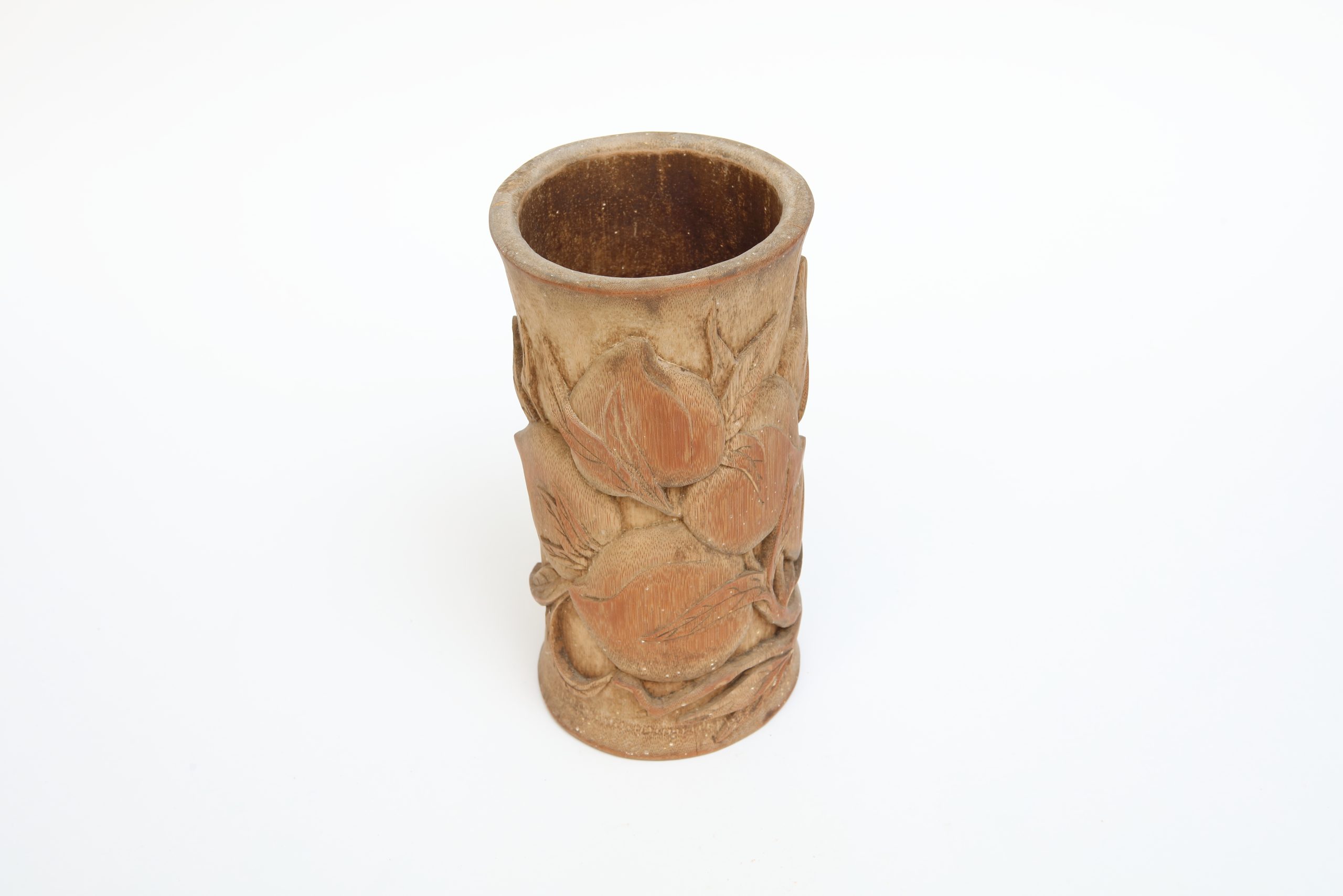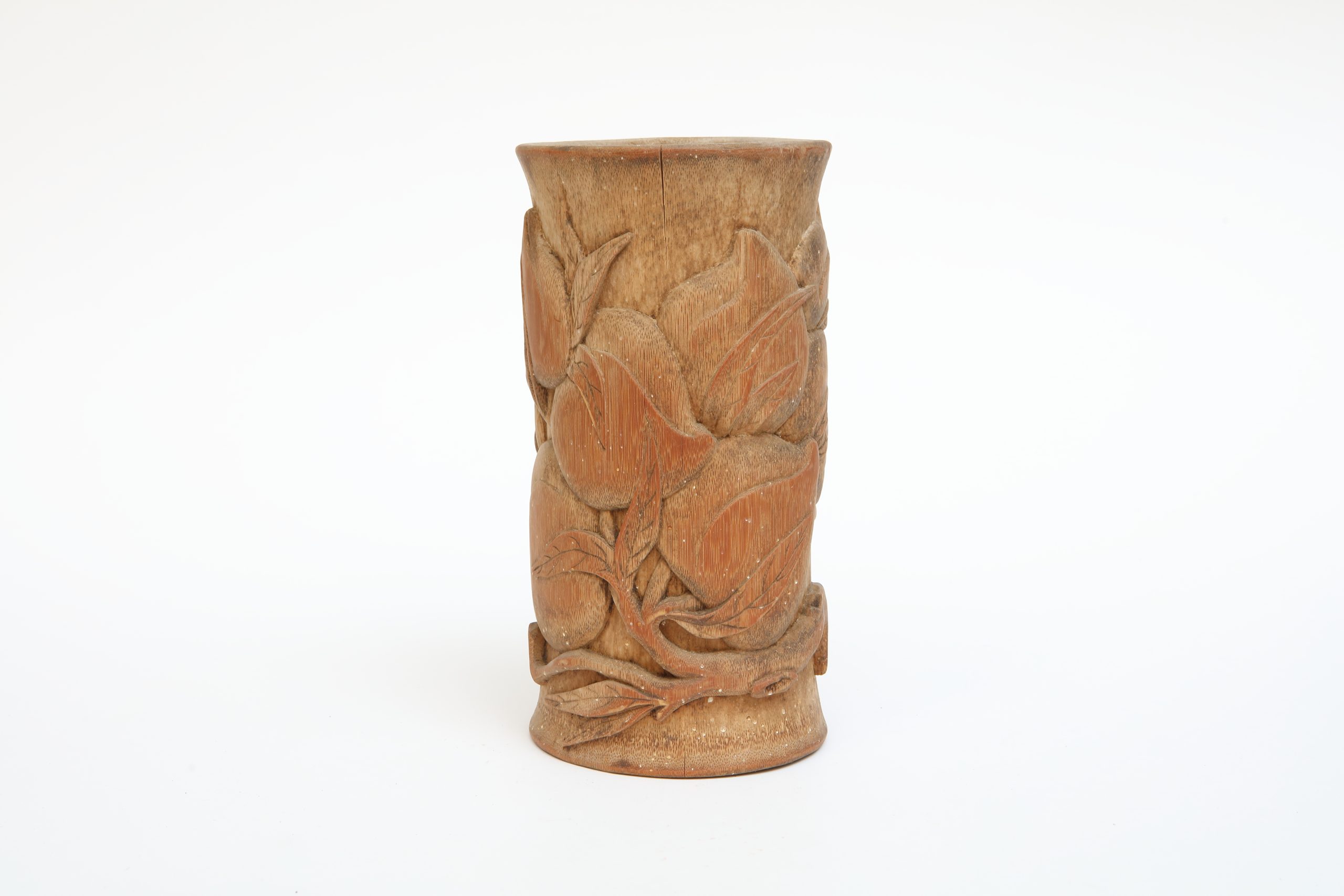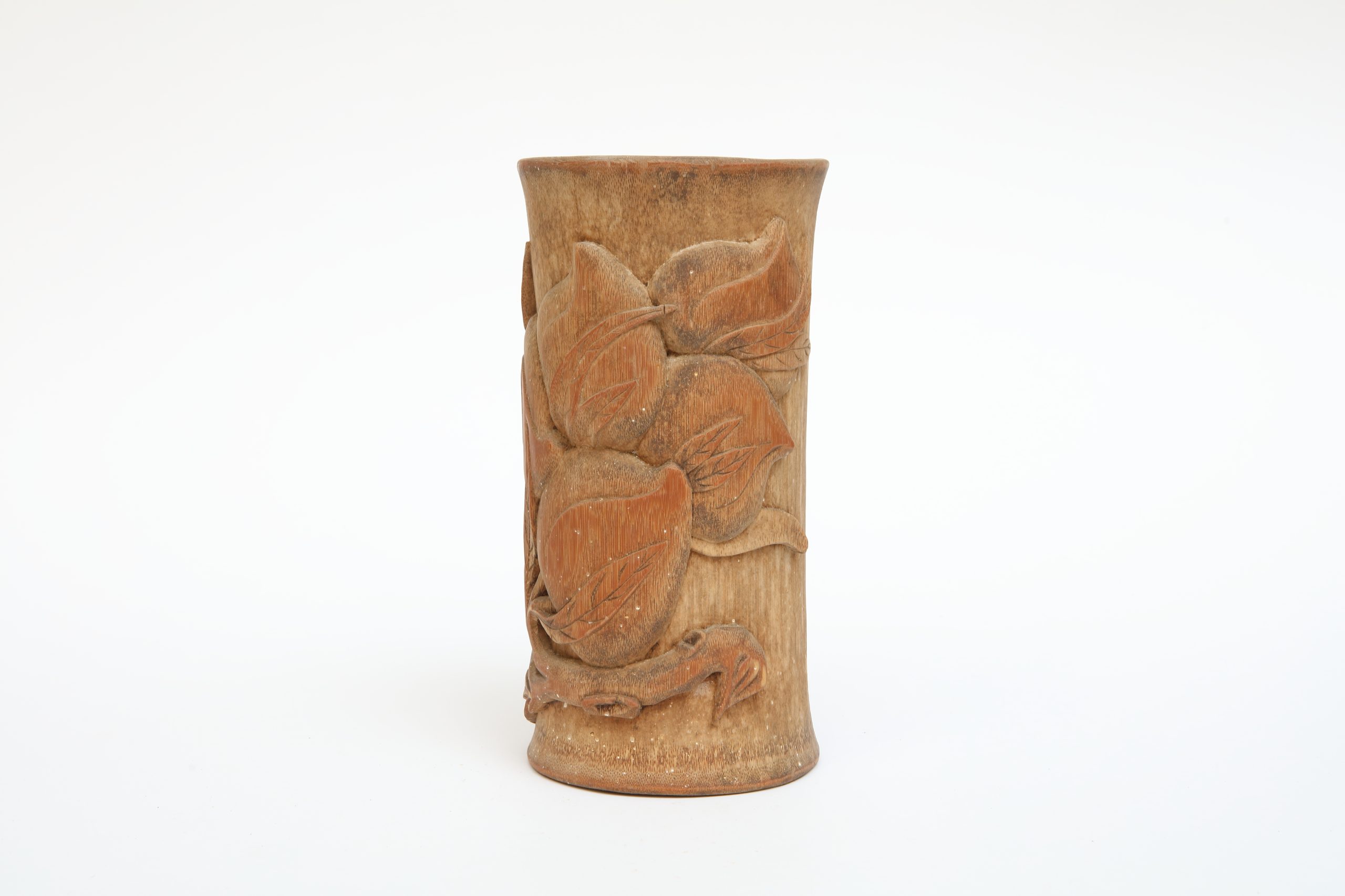 此件木雕器物以質樸而沉靜的姿態安放於書案之上,形制近於圓筒,比例端正勻稱,整體量體簡潔內斂,器身表面浮雕的枝葉紋樣鋪陳出豐富的視覺層次,枝梗穿插回旋,沿器身環繞鋪展,彷彿風中蔓生的自然,被時間凝定於溫潤的木質之內。使靜定的形體展演一種含蓄而流動的生命節奏。