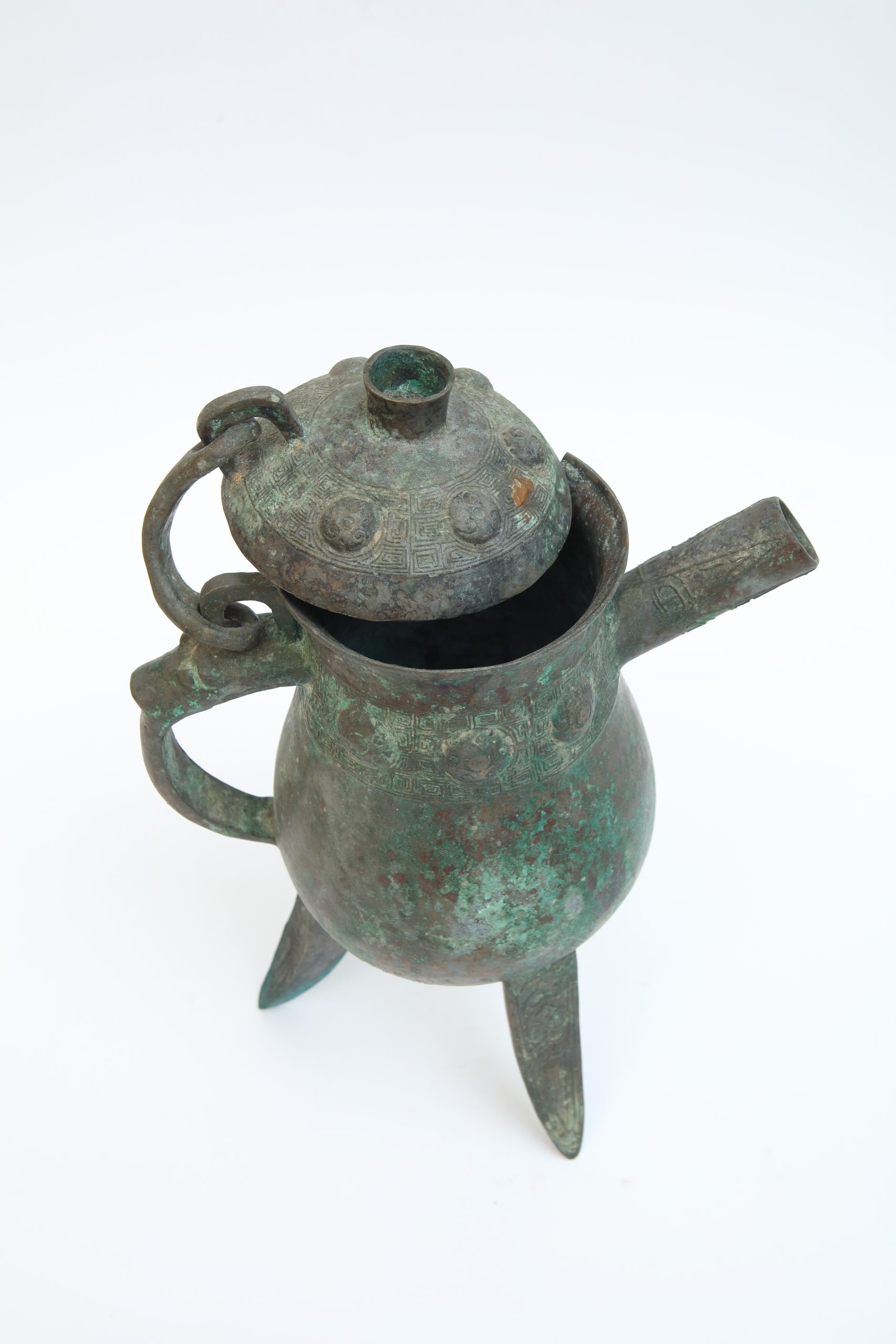 此器為仿青銅盉之作,承襲古代禮器之形制而再現於今。圓口深腹,覆蓋微隆,前設流口,後接曲鋬,下承三足,姿態穩定而昂然,渾厚中帶著一分靜穆,三足如靜立之獸,默默支撐著歲月的重量。整體綠鏽斑駁,如時光在其表面緩緩滲出,既非真正的滄桑,卻喚起歷史深處的回聲。