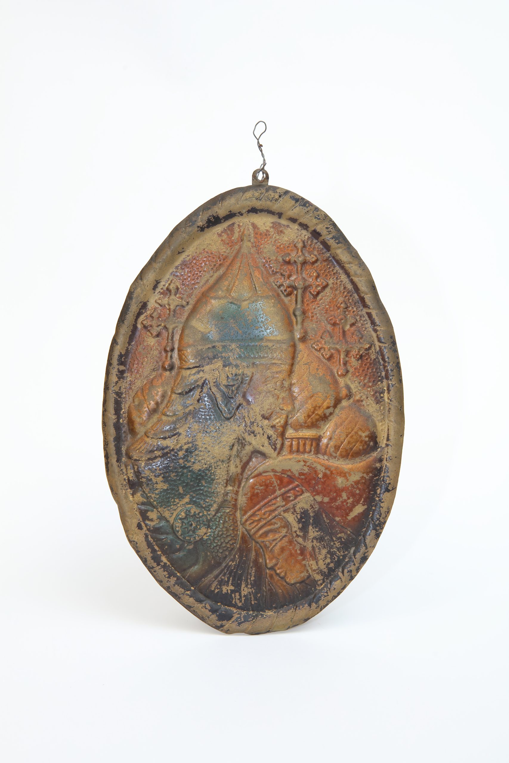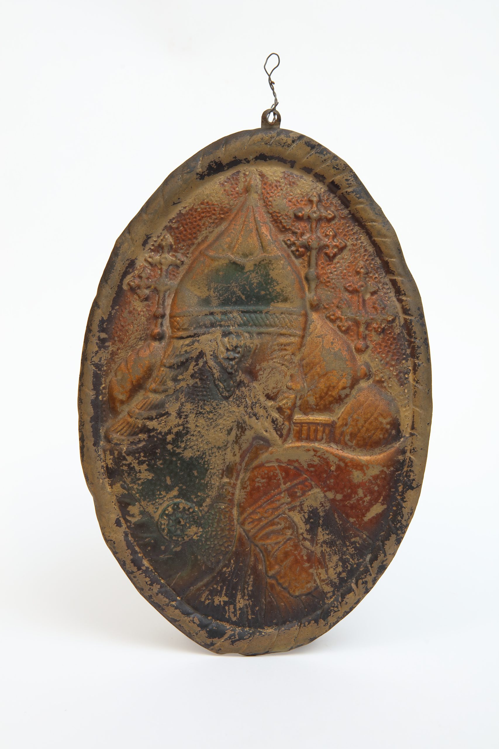 此件金屬浮雕以橢圓為形,靜靜懸掛,如一枚歷經歲月的護符。畫面中兩人相對守望,姿態端正而內收,其構圖並不著重個人特徵,而是將人物轉化為關係的象徵:結合、承諾、秩序與祝福。