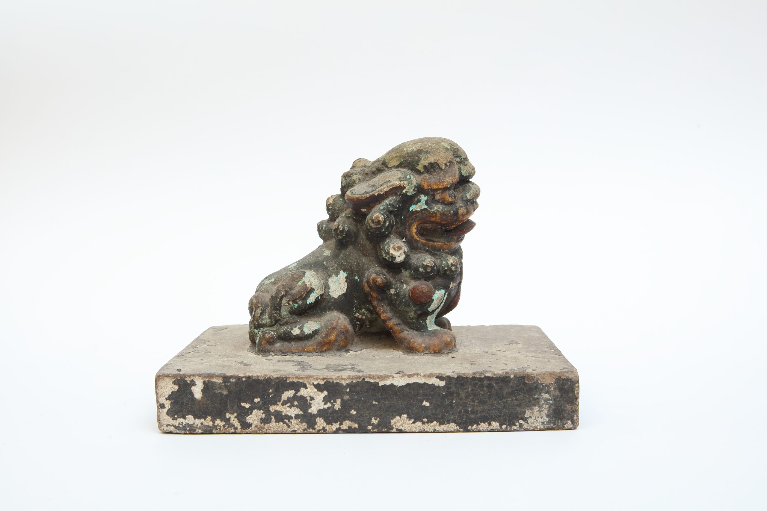 此件小型守護獸端踞於矩形基座之上,形制承襲傳統辟邪瑞獸的圖像。昂首啟口之姿,彷彿含納風聲;胸腹微挺,氣息內聚;四肢屈伏而蓄勢,重心低穩,如山石盤踞。鬃毛與肢體未作繁複寫實,而以概括而厚重的量感,凝縮為一種象徵性的存在,使形象在神獸與圖騰之間微微發光。