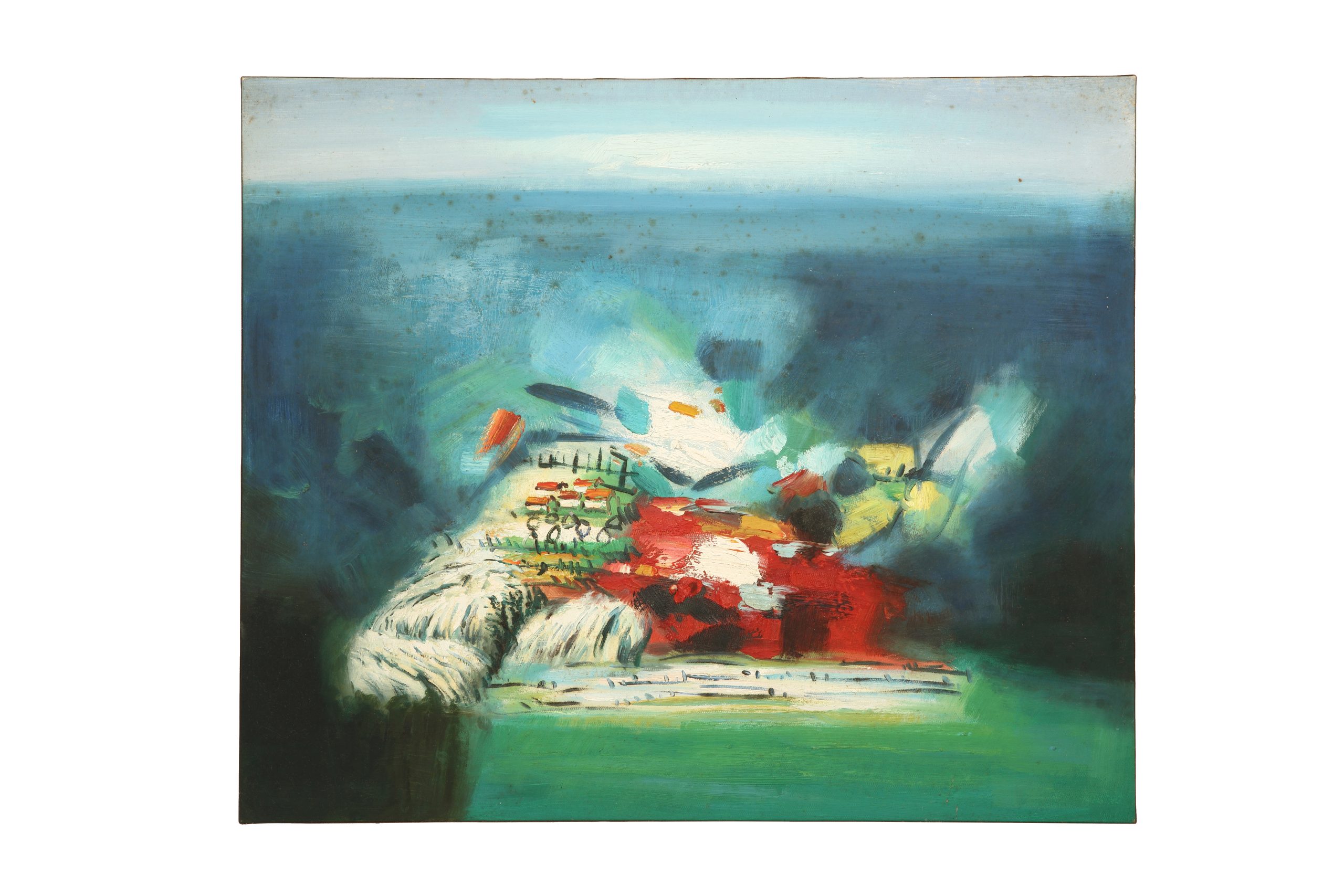 畫面上方鋪展著一層藍灰色域,細微的斑點與質變痕跡隱約浮現,那是時間在顏料表層留下的呼吸。彷彿薄霧輕覆天際,使空間多了一層歷史的靜默。視線隨之向下延展,深藍與青綠交融成一片廣闊場域,在色塊的推移與層疊中,緩緩鋪陳出心境的遠近。