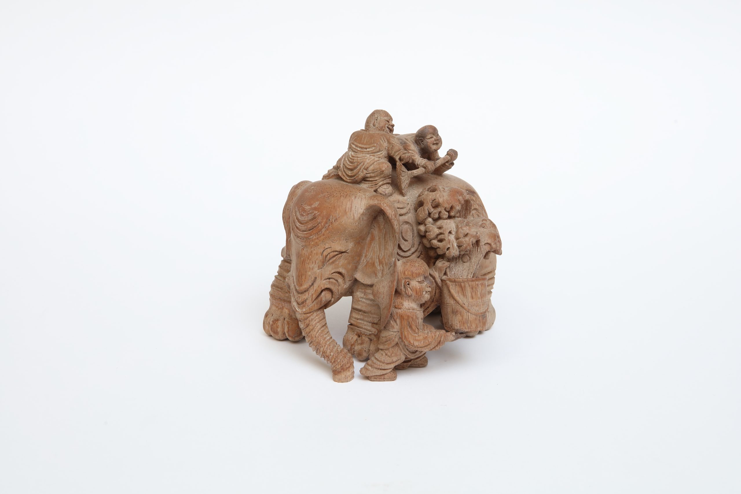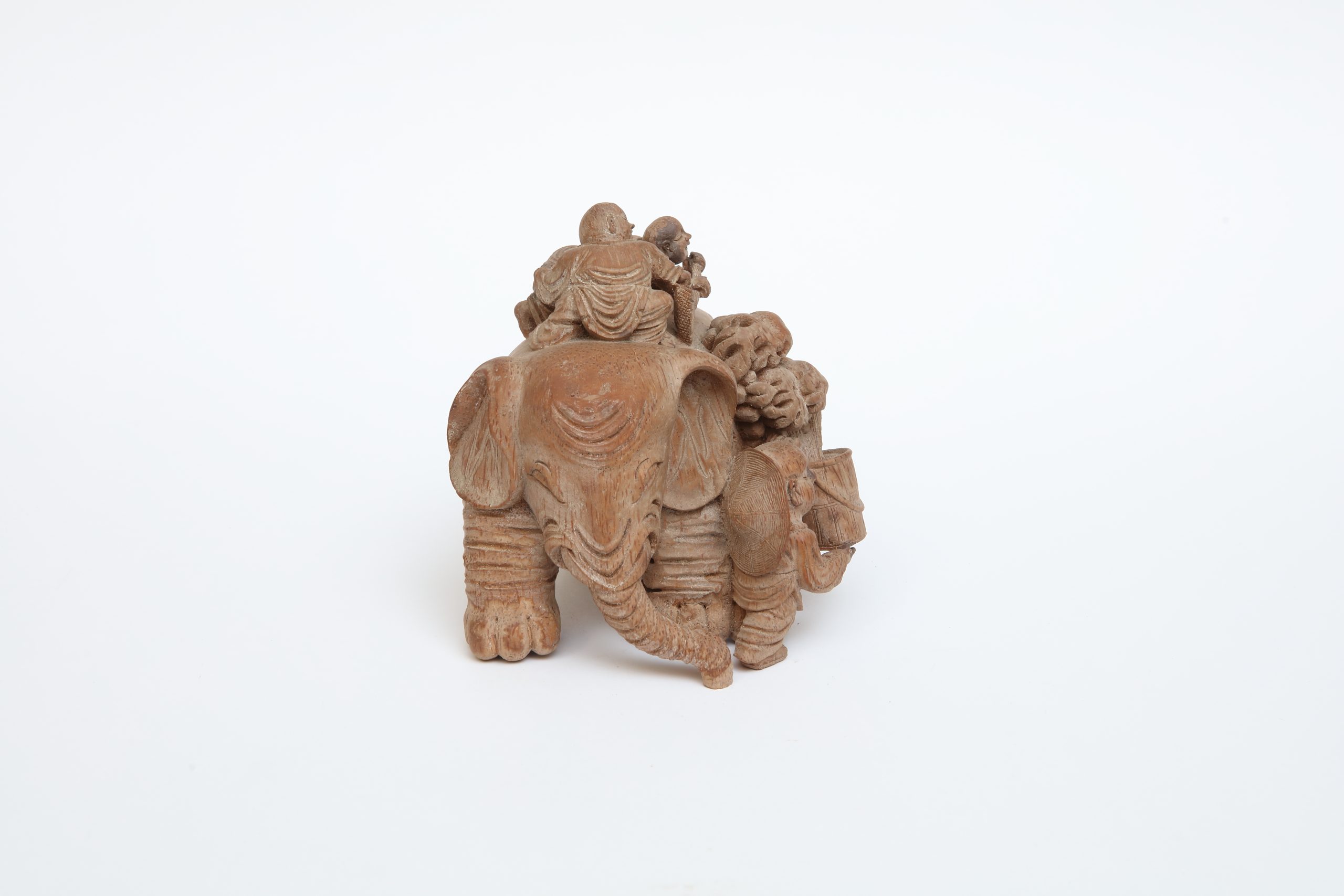 這是一頭木質的大象,沉穩地踏著步伐,彷彿從時間深處緩緩走來。象身的紋理如年輪般細密,每一道都低聲訴說著生長、承受與歲月的重量。