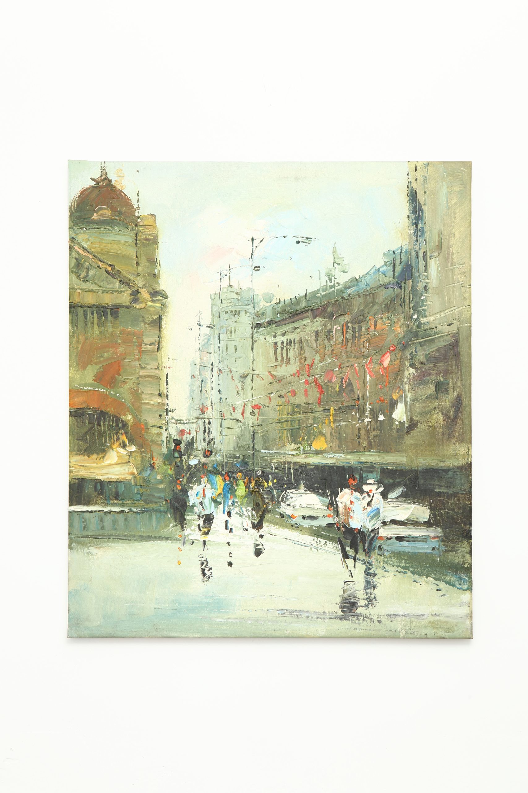 這件作品像似一段被反覆回望的風景,它或許源於某次短暫的駐足,卻在繪畫中轉化為溫柔的回憶——城市不再只是空間,而是一種被光線、濕度與心緒共同保存下來的感受。
